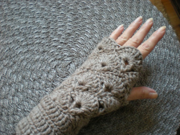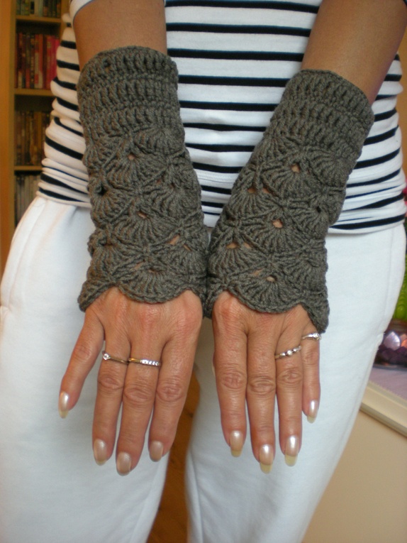 Kan brukes på to måter. Sånn som bildet og så kan tommel stikkes innimellom heklede skjell, så sitter de enda bedre.