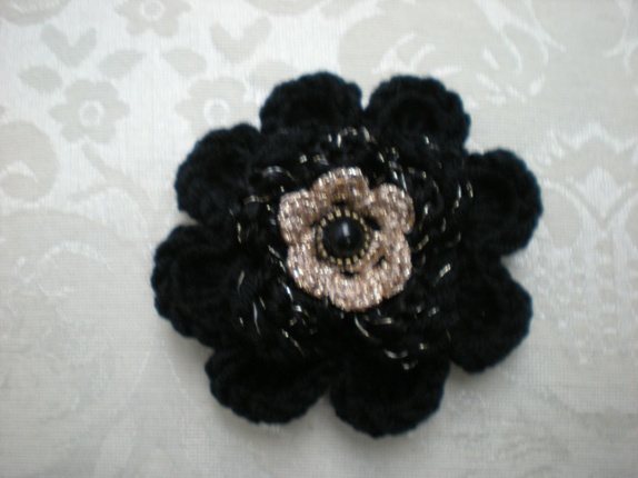 Farge: Sort med iheklet gulltråd på midterste blomst.Gullblomst og sort perle i midten.