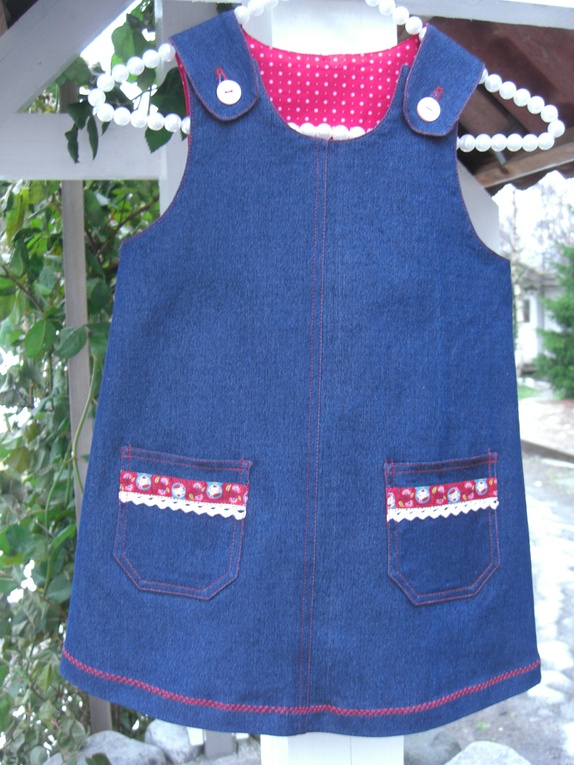 Overdelen i kjolen er foret i rødt bomullstoff,og har røde kontraststikninger.