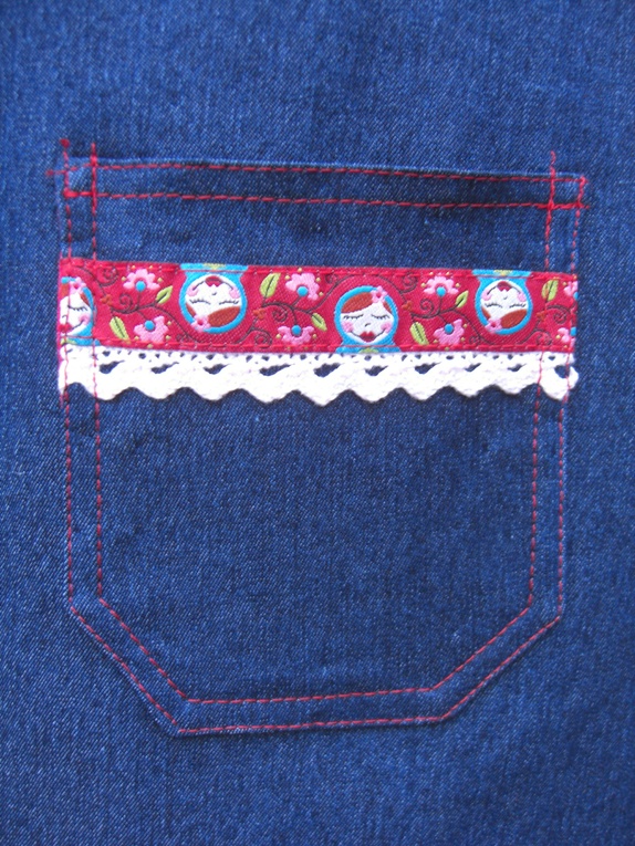 Kjolen er sydd i myk stretch dongeri,pyntet med rosa blonder og babuskabånd.