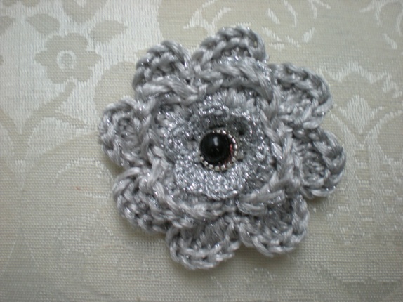 Farge: Lys grått merisert garn med iheklet sølvtråd, Sølvblomst med sort perle i midten.