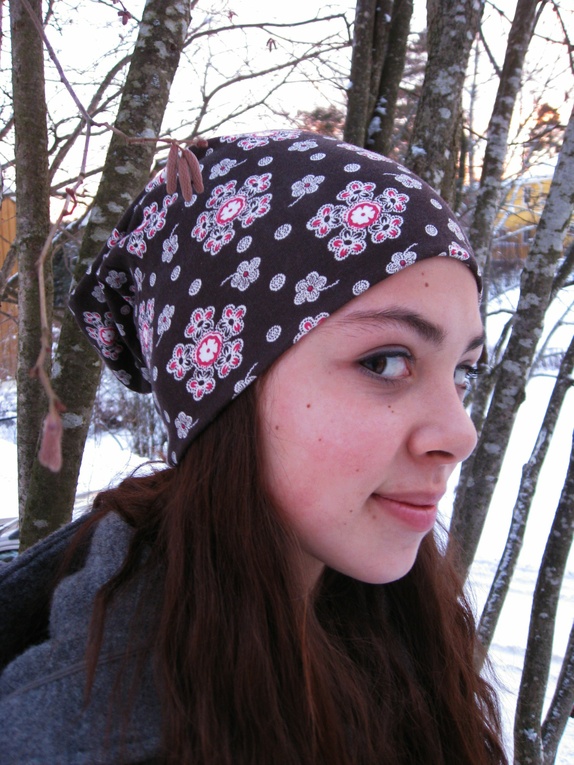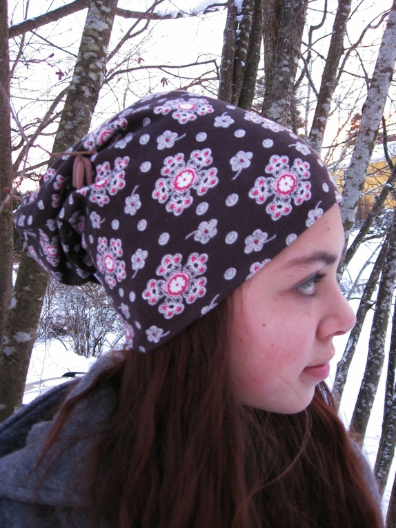 Myk og god lue i dobbel jersey. Luen er i brunt med hvite og rosa blomster og har en "baggy" fasong.