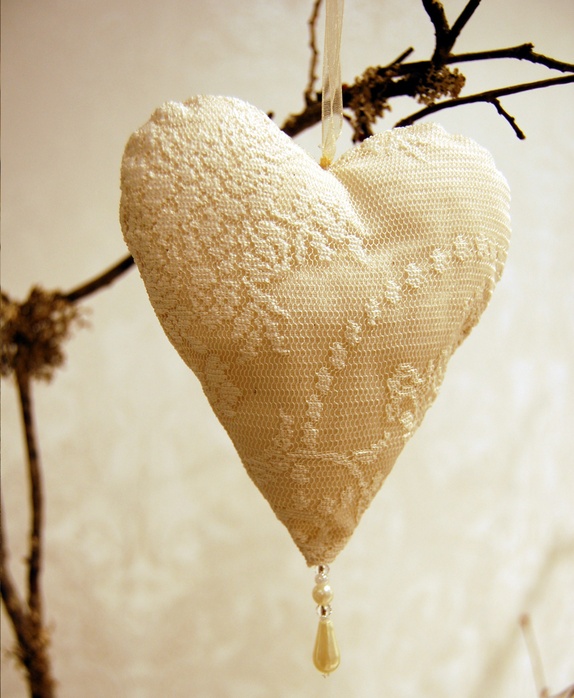 To lag med stoff. Innerst bommull og trukket over med blonde. Hjerte er dekorert med perler og vi har festet et vakkert bånd i toppen for å kunne henge det opp.