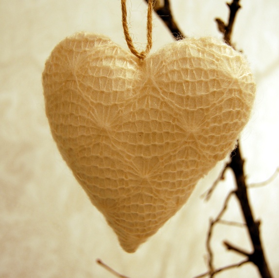 Hjerte er sydd med strikket stoff. I toppen fester vi de med grov hyssing, men også med et vakkert bånd i tyllorgansa for å kunne henge det opp.