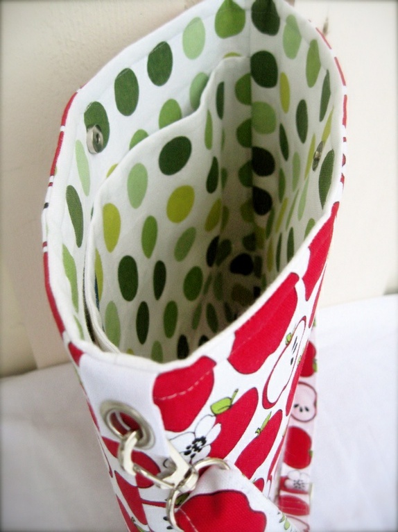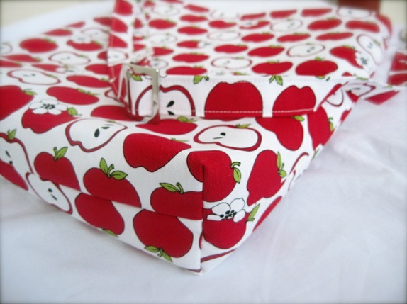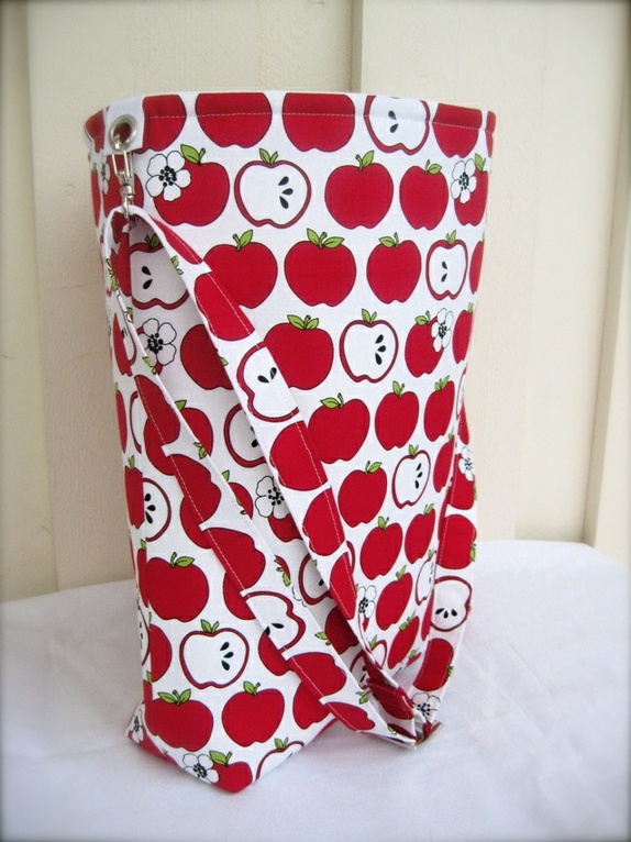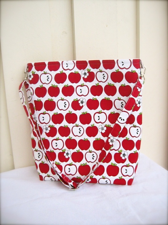 Personlig skulderveske sydd i solid bomull med røde epler på hvit bunn.
