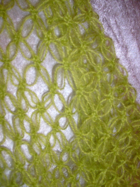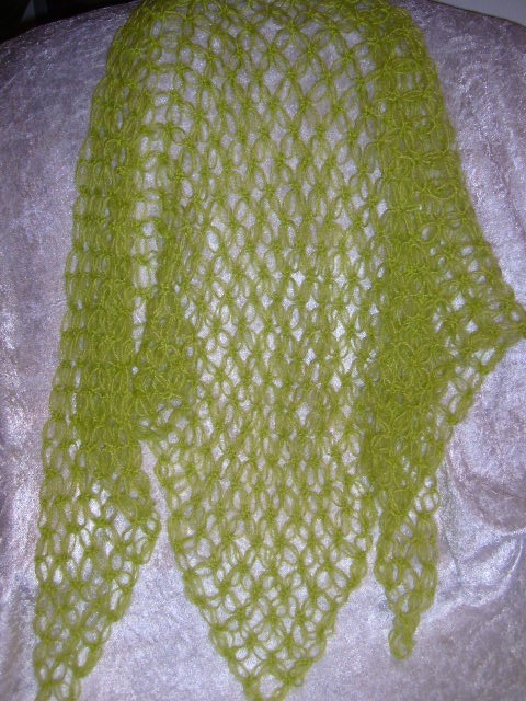 Et herlig og mykt englemaskesjal heklet i nydelig mohair i en frisk limefarge. Et kjempedeilig sjal å kaste over skuldrene eller ha rundt halsen som skjerf.