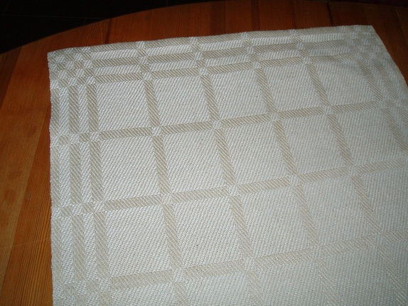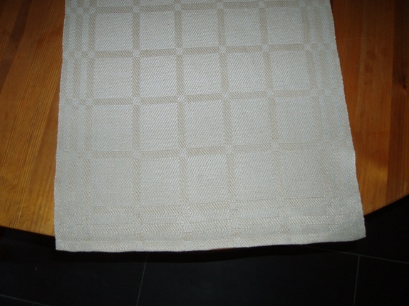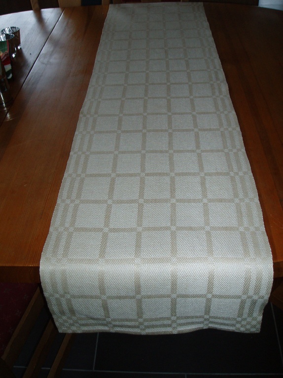 Løper i 100% linkvalitet. Innslaget er litt lysere enn renningen. Bør rulles etter vask. Størrelse: ca 39 x 160 cm.Teknikken er dreiel på 8 skaft.