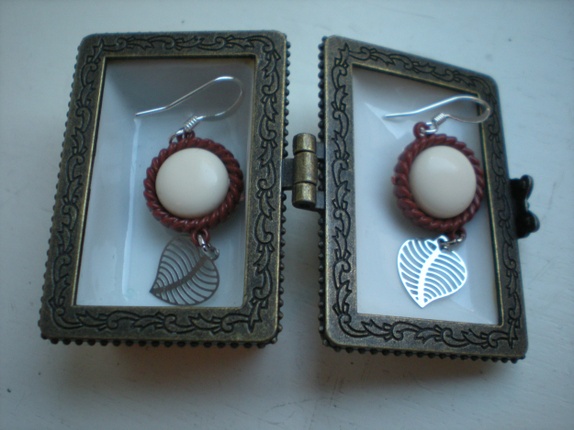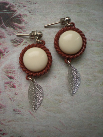 Denne serien smykker er basert på brune og sorte plastperler med ulike detaljer. Noen av øredobbene har swarovski-hjerter nederst, andre har "sølv"- eller "gull"-blader, som her.