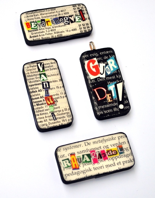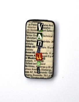 Dette anhenget består av en dominobrikke som er dekorert med forskjellige ting som feks papir utklipp, servietter og bånd for å skape en liten unik og dekorativ collage. Overflaten er beskyttet av 3 lag blank lakk.