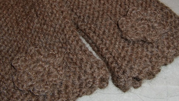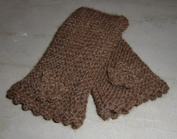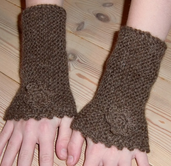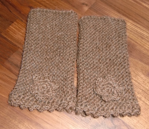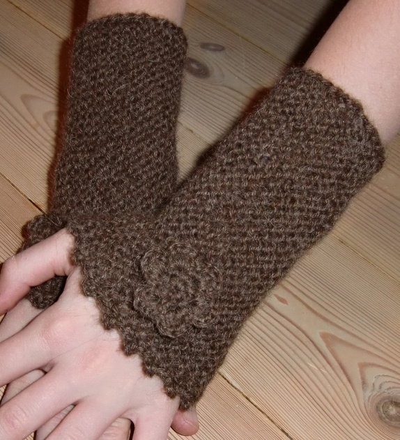 Deilige, myke plusvarmere i brun alpakka.Strikket pulsvante, med heklet kant og blomst.