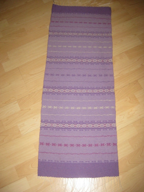 Lilla løper i rosebragdVevd i tynt ullgarn,bomullsrenning.Str 105-38(utenom frynser)Pris kr 500