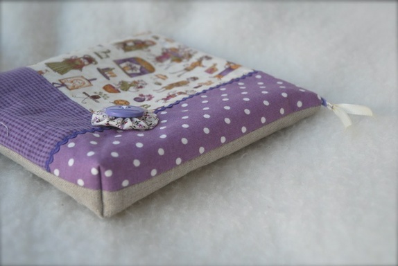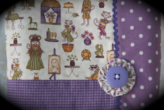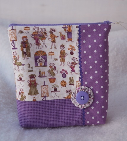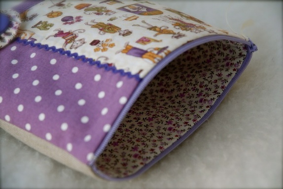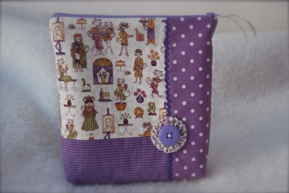 - En middels stor pung laget i ulike lilla nyanser i bomull, baksiden er ren lin.