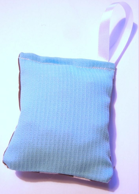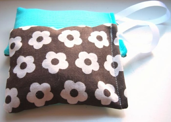Blomstret forside, turkis bakside.Ca. str: 10 cm x 7 cm.