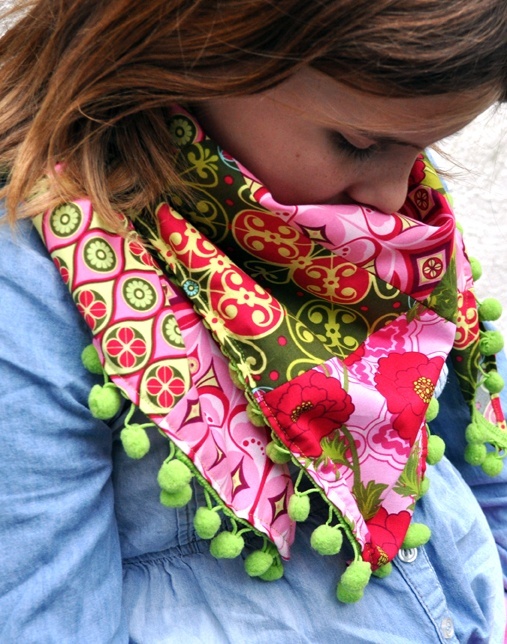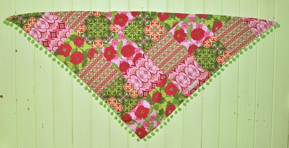 Lappeskjerf i rosa og grønt med en kant av grønn pompom.Sjalet er i 100% bomull og ca 85 x 85 x 130 cm stort.(Det er ikke foret)