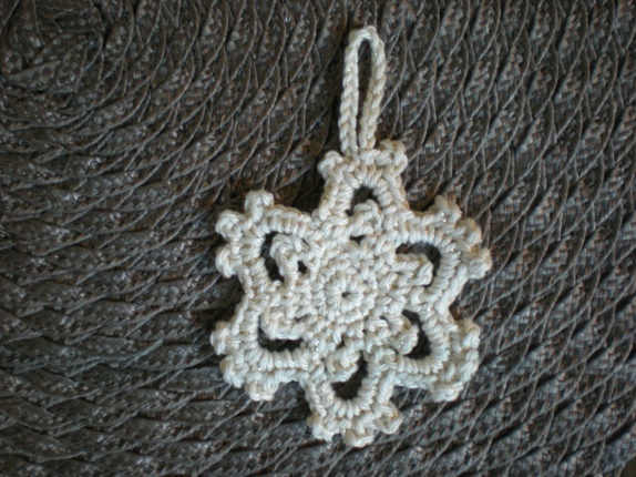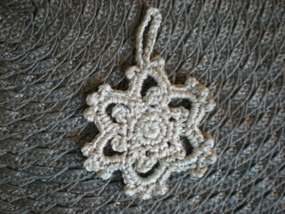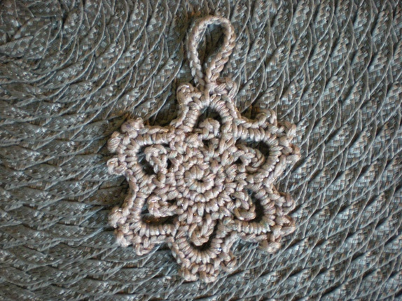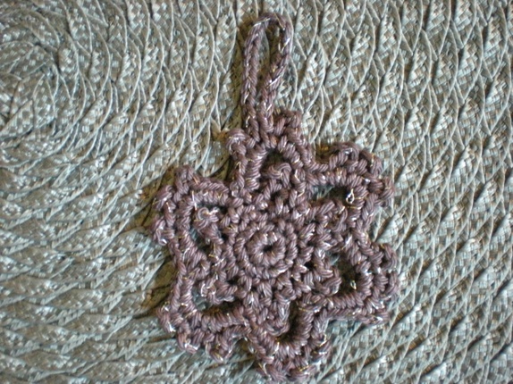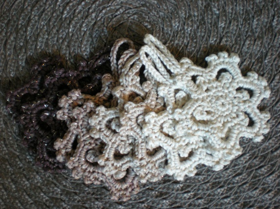 Søte stjerner i bomulls/polyestergarn.Str. ca 8 cm i dia.Farger: Offwhite/beige/brun toner med iheklet gulltråd.