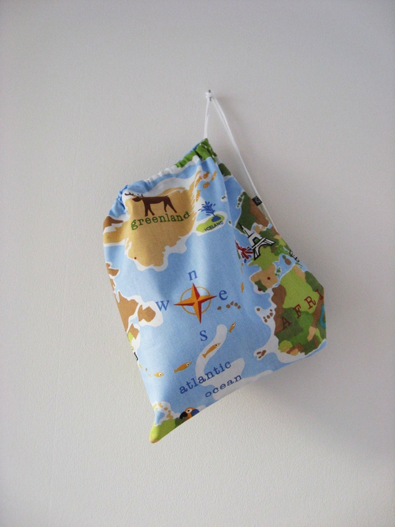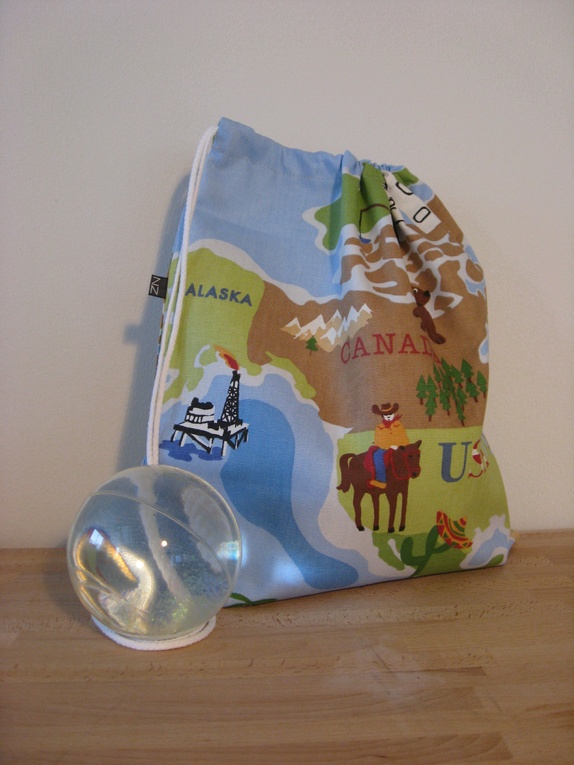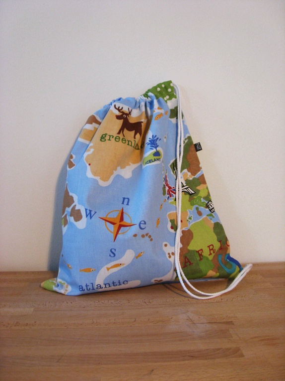 Gammeldags gympose sydd i kraftig bomull. Posen har snørelukning med åpning på toppen. Motivet på denne posen er et utsnitt av verdenskartet: Canada, USA, Grønland...