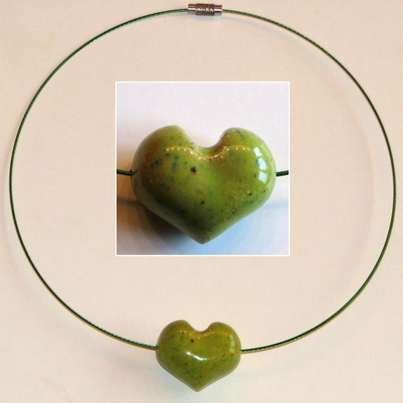 Helglasert limegrønt keramikkhjerte med gjennomgående hull, som henger i en grønn wire med skrulås. Diameter wire: 14 cm.