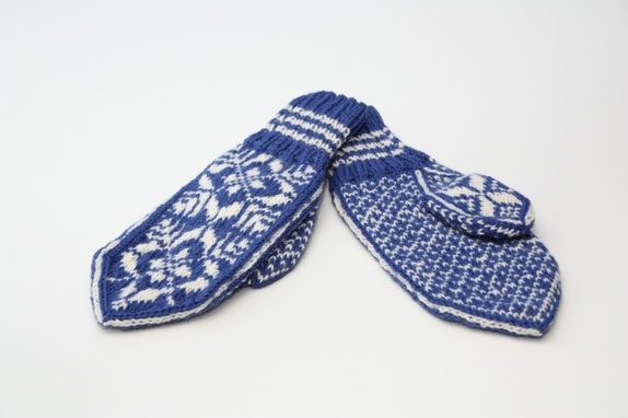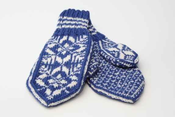 Blå selbuvotter med hvitt mønster i 100% ull. Vottene har elastisk vrangbord på ti centimeter som kan trekkes over ermer på jakker eller gensere, og passer til store hender, enten dame eller herre.