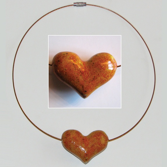 Oransje helglasert keramikkhjerte i oransje/bronsefarget wire med skrulås. Diameter wire: 14 cm.