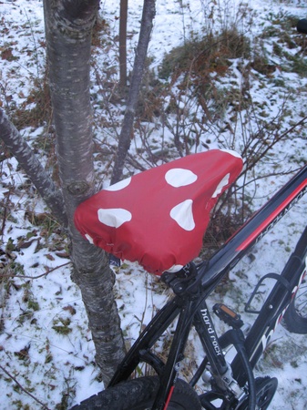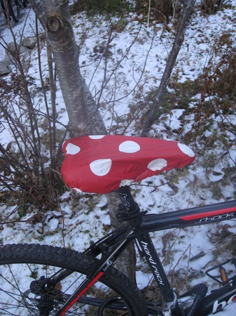 Smart regntrekk til sykkelsete sydd i et plastikkbelagt bomullsmateriale. Trekket er formsydd og kantet med skråbånd som fungerer som løpegang til strikken som holder trekket på plass. På undersiden mot stangen ned fra setet er det sydd på en bred strikk slik at trekket sitter stødigere.