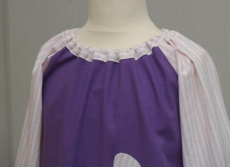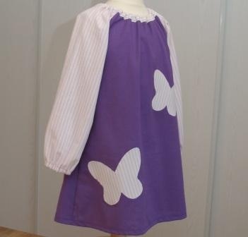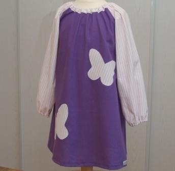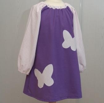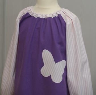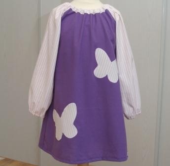 Søt rynkekjole med lange armer, sydd av en tynn bomullsduk og sengetøy. Selve kjolen er ensfarget lilla, mens armene og halskanten er lys rosa og hvit stripete. Kjolen er pyntet med to sommerfugler i samme stoff som armene. Rund hals med strikk, samt strikk nederst i armene.