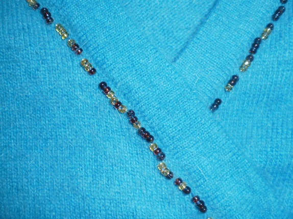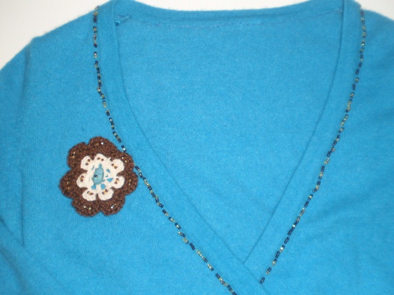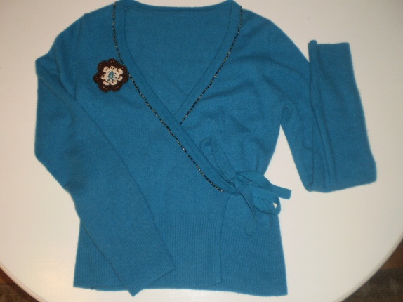 Turkis omslagsjakke med påsydde perler og heklet blomsterpynt. Str M/L