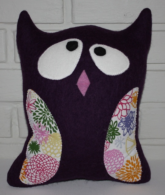 Koselig Ugle Pute i lilla Ull. Applikerte vinger av flerfarget bomullstoff. Måler ca 32x25 cm.