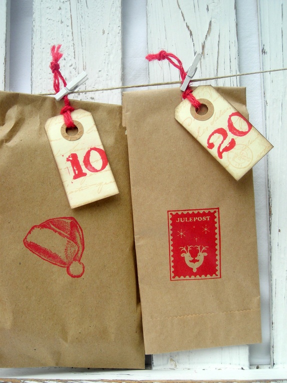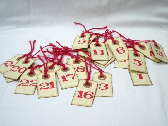 Lappene har svertede kanter for en vintage look, og tallene 1-24 er håndstemplet i rødt. Adventslappene har røde jutebånd.