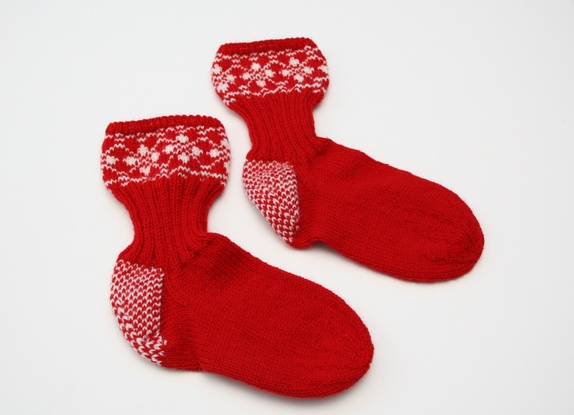 Røde selbusokker med hvitt mønster i 100 % ull. Ribbestrikkfeltet over ankelen gir en veldig god passform, og mønsterkanten øverst holder sokkene oppe.