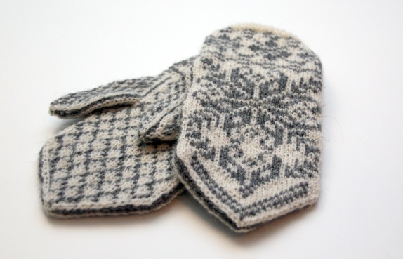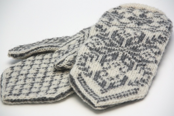 Offwhite selbuvotter i 100% ull, med grått mønster. Vottene har god passform med en liten centimeters vrangbord. Dette votteparet vil passe til små damehender.