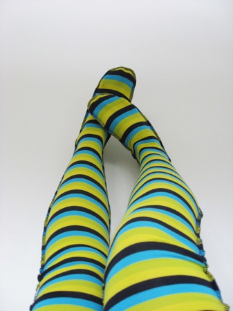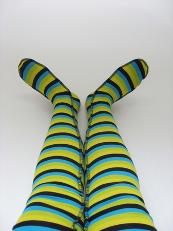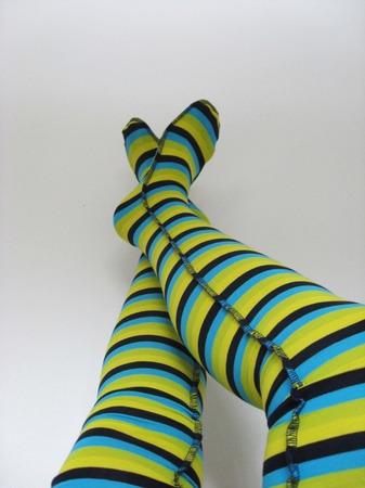 Lange, deilige knestrømper som rekker til knærne. De er sydd i stripete bomullsjersey i blått, turkis, grønt og gult. Knestrømpene er fasongsydd med en dekorativ overlocksøm på utsiden. De finnes i 2 størrelser: 36-38 og 39-41