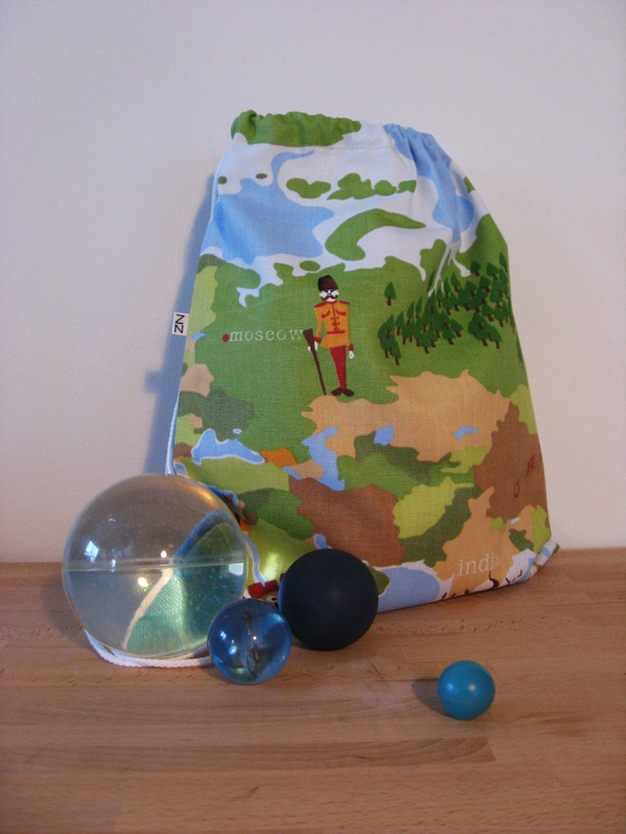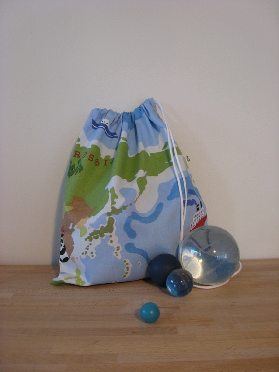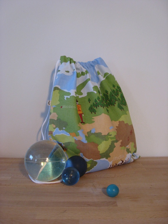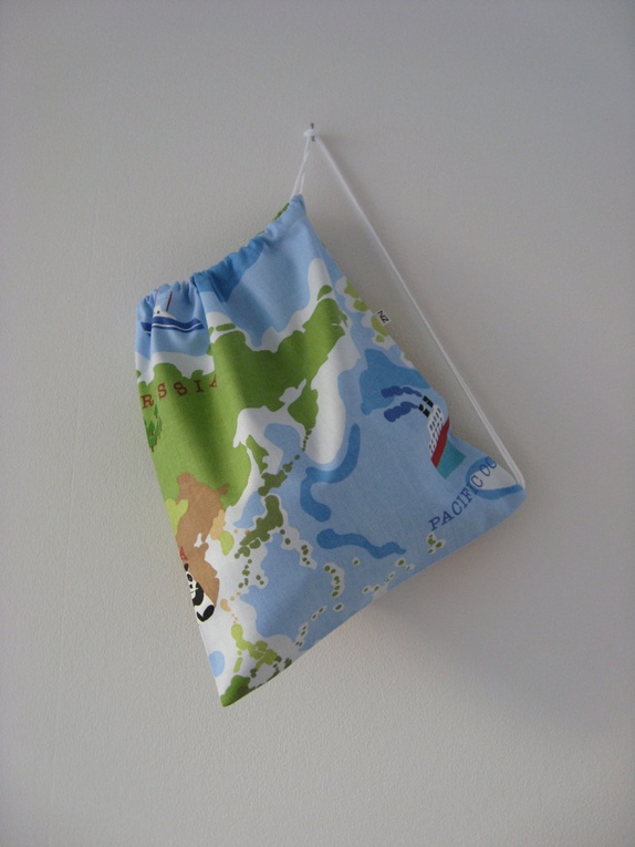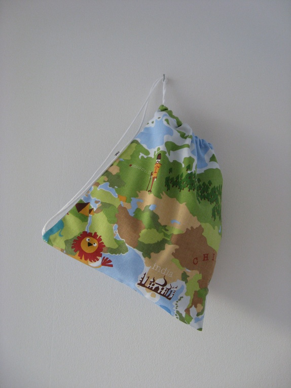 Gammeldags gympose sydd i kraftig bomull. Posen har snørelukning med åpning på toppen. Motivet på denne posen er et utsnitt av verdenskartet: Russland, Kina, India...