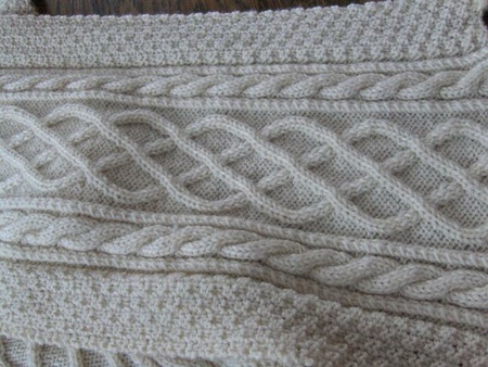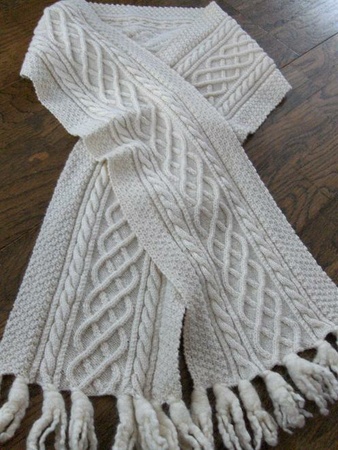 Håndstrikket skjerf med flettemønster. Strikket i babyull, og med litt røffe, tovede frynser i kantene.Skjerfet måler ca.165x18 cm.