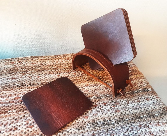 5 glassbrikker og en holder i lær