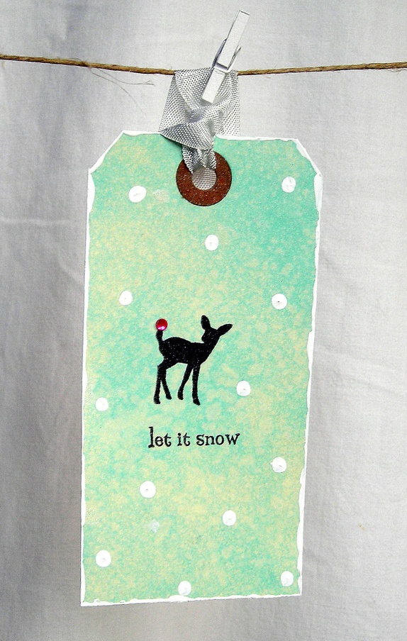 Lappene er farget med en lekker lys turkis farge og sølvhvitt shimmer. Et lite dådyr og "Let it snow" er håndstemplet i sort, og dådyret har en knallrosa "edelsten" på haletippen. Snøfnugg og hvite kanter hører med. På baksiden er det stemplet "Til" og "Fra", og det er plass til å skrive en evt personlig hilsen. Gavelappene har sølvhvite sløyfebånd.