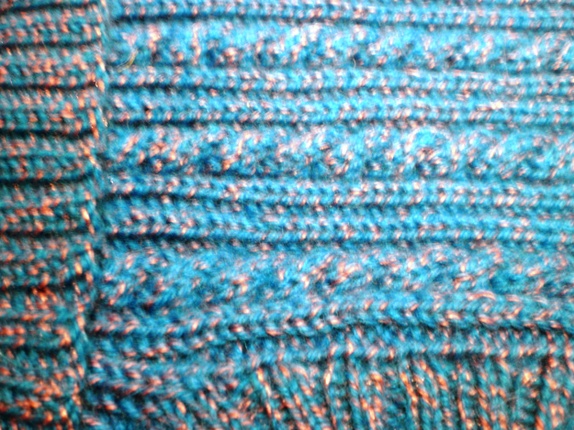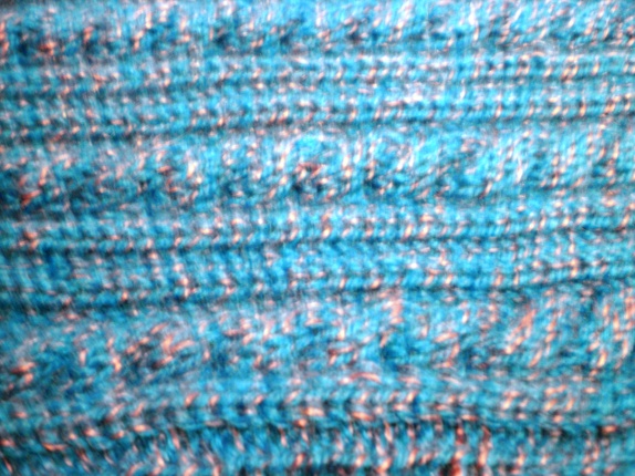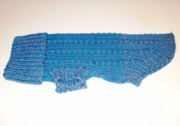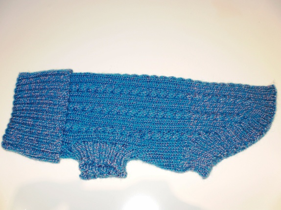 Hundegenser i flettestrikk.Strikket i blått garn, tvunnet med en tynnere tråd i lilla med nydelig glans.Lengde: 45 Omkrets: 41Ren ullHåndvask. Strekkes i fuktig tilstand.