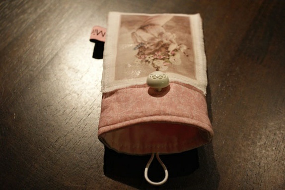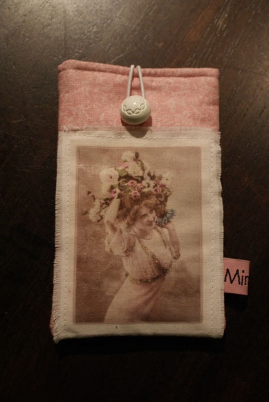 Etuiet har et bilde fra før i tiden i front med ei nydelig dame med blomster.