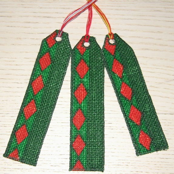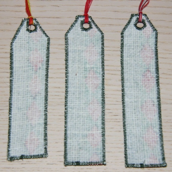 Sydd av en strieduk fra loppis. De er kantet med mørk grønn sytråd og snora er laget av rød vevrenning som også er funnet på loppemarked.