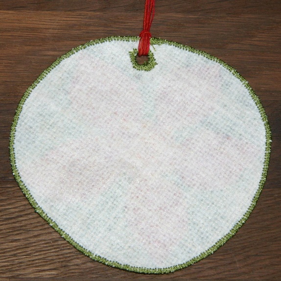 Lapper med julestjerner sydd av en løper fra loppemarked. De kan brukes som til/fra-lapper eller juletrepynt. Kantene er kastet over med grønn sytråd og snora er laget av rød vevrenning som også er fra loppis.