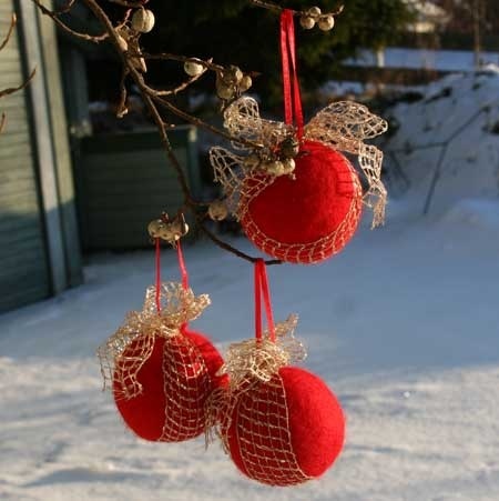 3 tovede julekuler med gullpynt.Kulene er ca 8 cm i diameter