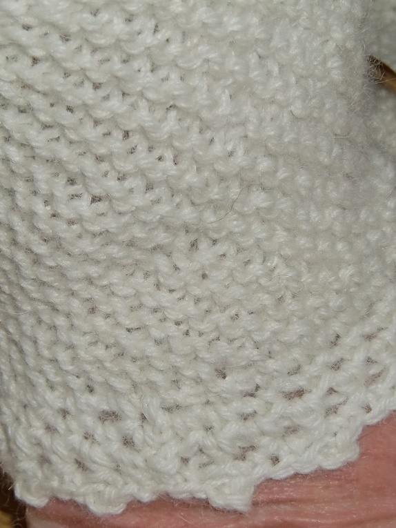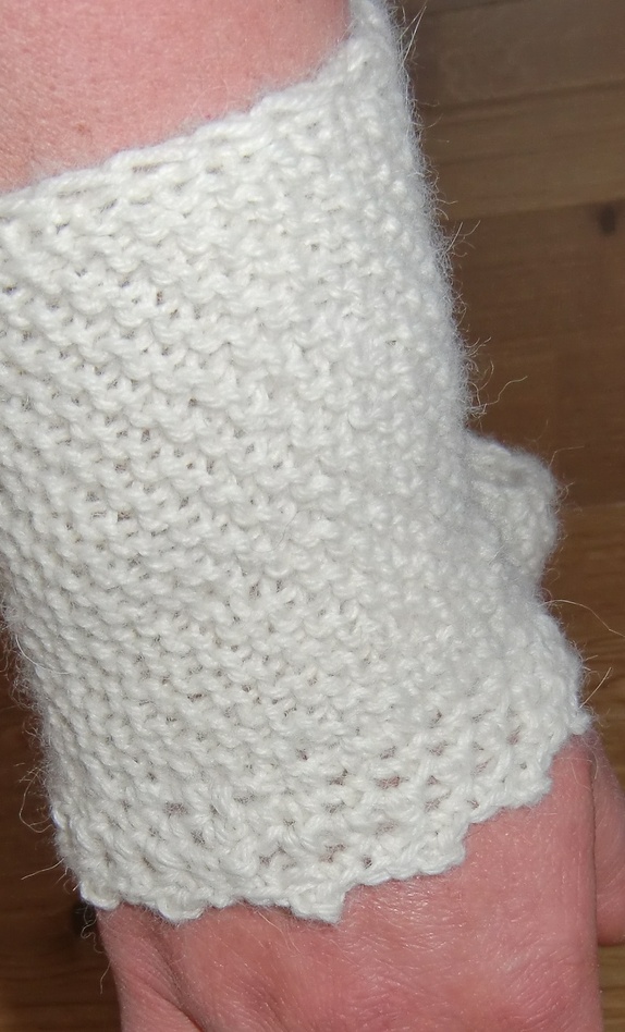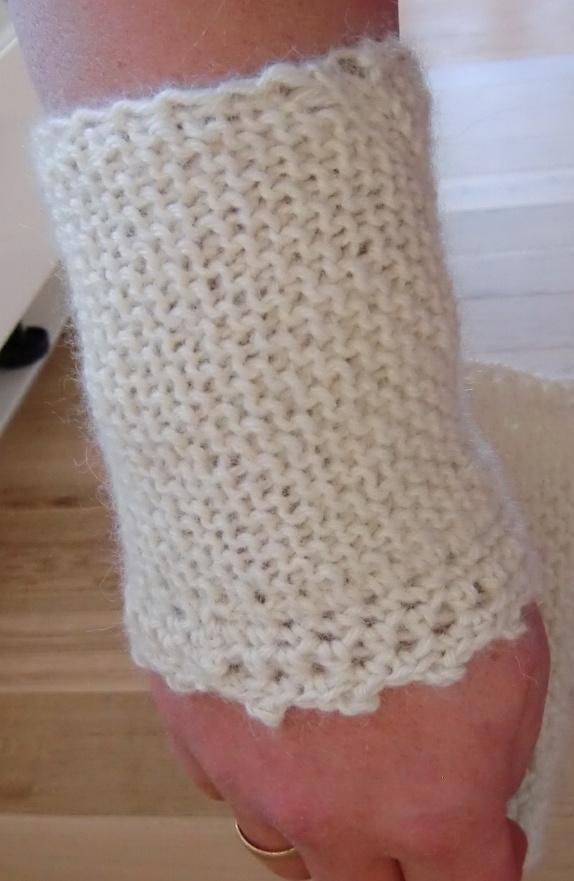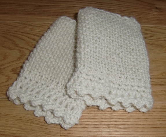 Utrolig myke plusvarmere i offwhite alpakka.Pulsvante strikket på skrå, med heklet kant.