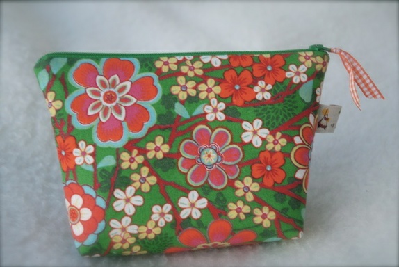En middels stor sminkepung laget i bomull.Foret med stoff i kremfarget bomull.