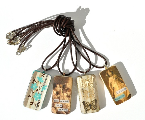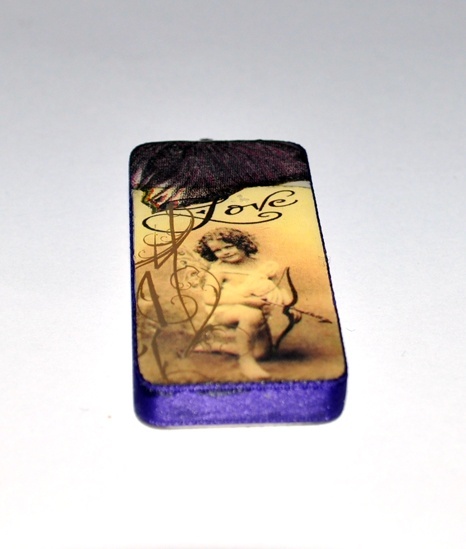 Dette anhenget består av en dominobrikke som er dekorert med forskjellige ting som feks papir utklipp, servietter og bånd for å skape en liten unik og dekorativ collage. Overflaten er beskyttet med dimensional lakk som gir motivet dybde.