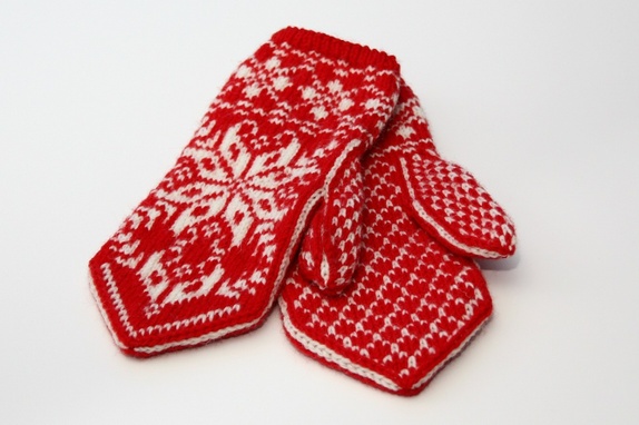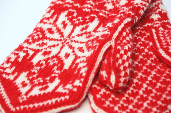 Røde selbuvotter i 100% ull, med hvitt mønster. Vottene har god passform, og har en liten centimeters vrangbord nederst. Dette paret vil passe til litt store damehender.
