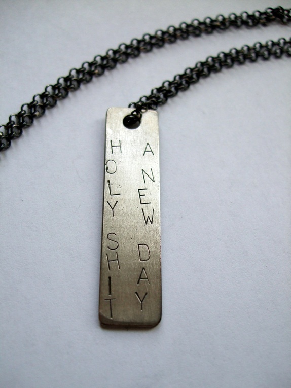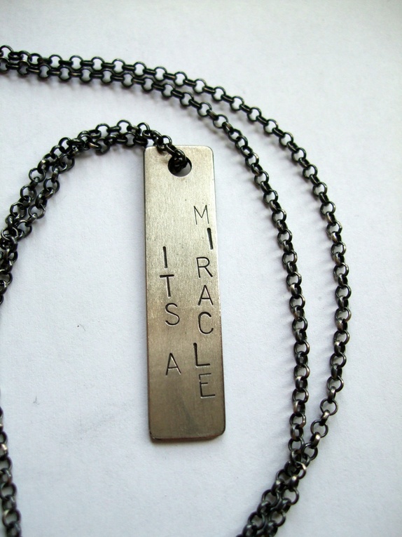 Anheng i oksydert sølv med 52 cm langt ertekjede, også i sølv. På den ene siden står det "holy shit a new day" og på den andre siden: "its a miracle".