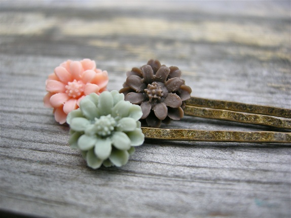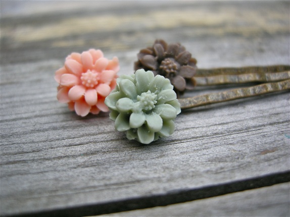 3 nydelige hårspenner i brun,grønn og fersken.Hårnål i oksydert kobber med akrylblomster.Limet er profesjonelt smykke lim og etterpå lagt i herder. Hver spenne måler ca 5,5 cm.