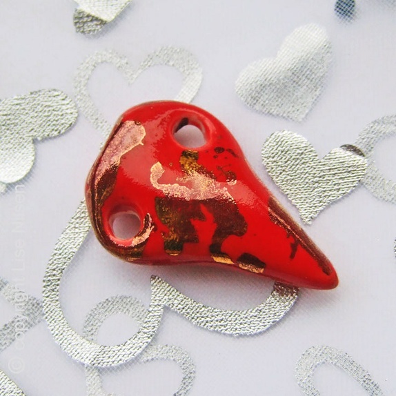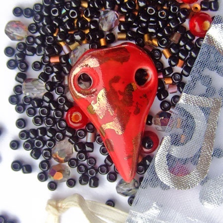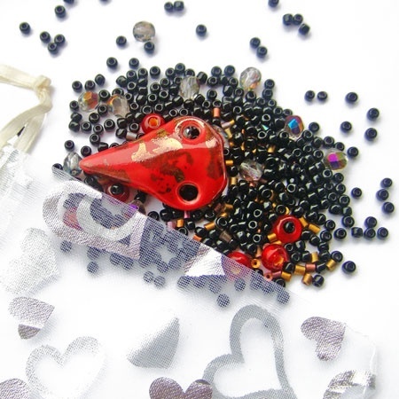 En organzapose med perler og en håndlaget porselensbit for deg som vil lage smykke, veske, jakke... det kan brukes til så mangt.