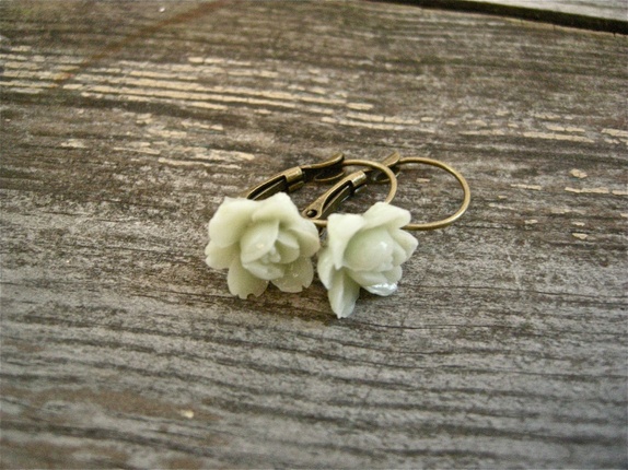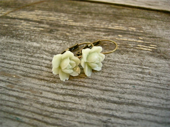 Vakre øredobber med lys lys grønn blomst.ørekrok i oksydert kobber med sikkerhetslås bak.Limet er profesjonelt smykke lim og etterpå lagt i herder.