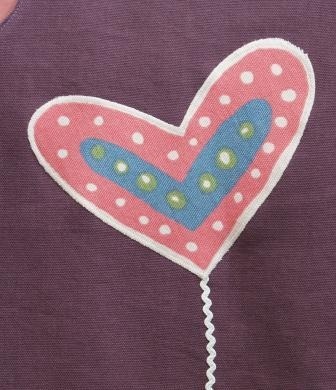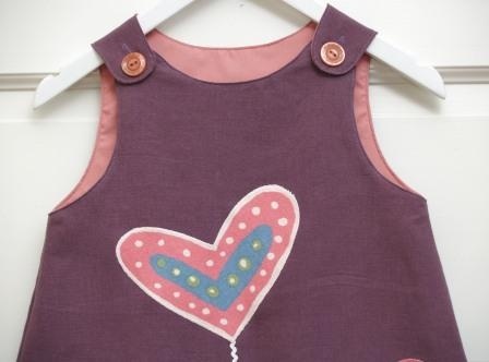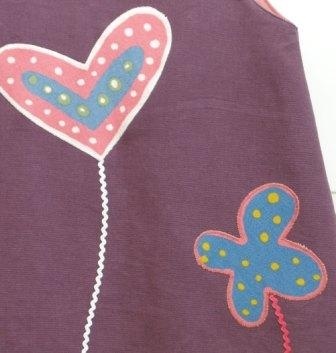 Søt og solid hengslekjole, sydd av en ensfarget lilla duk i kraftig, litt grovt bomullsstoff. På forsiden er kjolen pyntet med et hjerte og to blomster som står på svaiende stilker av kroklisser i ulike farger. Rosa knapper i selene. Kjolens overdel er foret med et ensfarget rosa bomullsstoff.
