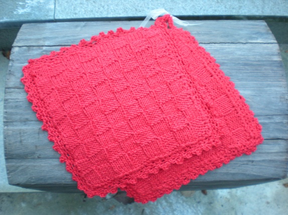 Strikket i bomullsgarn, doble med heklet kant og hempe. Maskinvask 60%.